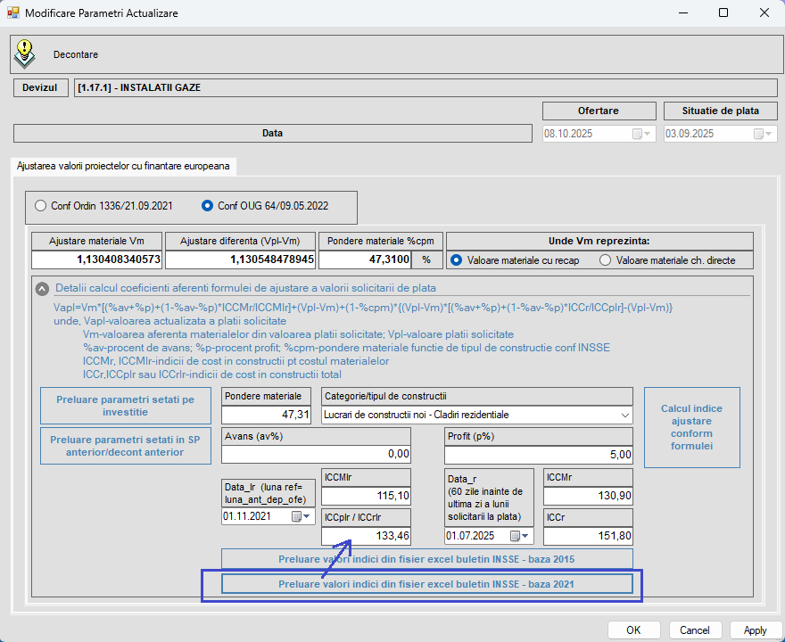 Conform circularei nr. 48333/02.04.2024 MIPE (Ministerul Investițiilor și Proiectelor Europene) lucrările în curs execuție, care au deja situații de plată anterior datei de 1 decembrie 2023 vor folosi în continuare indicii de cost în construcții în funcție de anul de bază 2015 si ?vechiul? sistem de ponderare, respectiv indicii de cost în construcții în baza 2021 pentru lucrările noi, sau cele care nu au Situații de plată întocmite până la 1 decembrie 2023. Circulara nr. 48333/02.04.2024 MIPE poate fi consultată de aici. Formula de calcul pentru indicii în baza 2015 pentru indicii ulterior datei lunii decembrie 2023 publicată de MIPE este: NOTĂ: Indicii ICC și ICCM calculați in baza2015 conform formulei furnizate de MIPE pot avea valori diferite față de valorile furnizate de INSSE: În pagina de configurare Parametri decontare, în partea de jos a ferestrei există 2 butoane corespunzător celor 2 sheeturi excel "tab. 15" și "tab. 15_baza2021". Astfel se apelează butonul aferent speței în care se încadrează SP-ul dvs.