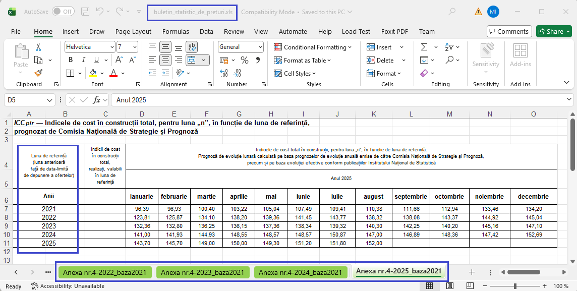 Anexa nr.4 conține indicii ICCplr (Indicele de cost în construcții total prognozat) pentru luna "n", în funcție de luna de referință. Documentul oficial care conține Anexa nr.4 poate fi consultat de AICI, și este disponibil pe site-ul Agentiei de Dezvoltare Regionala Nord-Vest . Anexa nr.4 îi corespund 4 sheeturi în excelul buletin_statistic_de_preturi.xls din cadrul aplicației Deviz Profesional, sheeturi cu denumirile: Anexa nr.4-2022_baza2021, Anexa nr.4-2023_baza2021, Anexa nr.4-2024_baza2021 și Anexa nr.4-2025_baza2021. Preluarea valorii indicelui ICCplr se face ca în imaginea de mai jos: