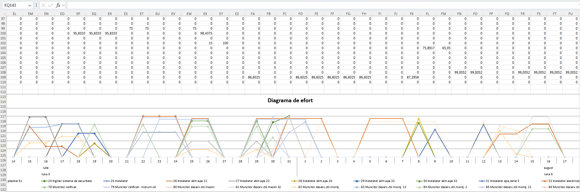 După generarea graficelor și diagramelor în excel, diagrama de efort o regăsiți într-un sheet distinct Diagrama Efort ca în imaginea de mai jos: