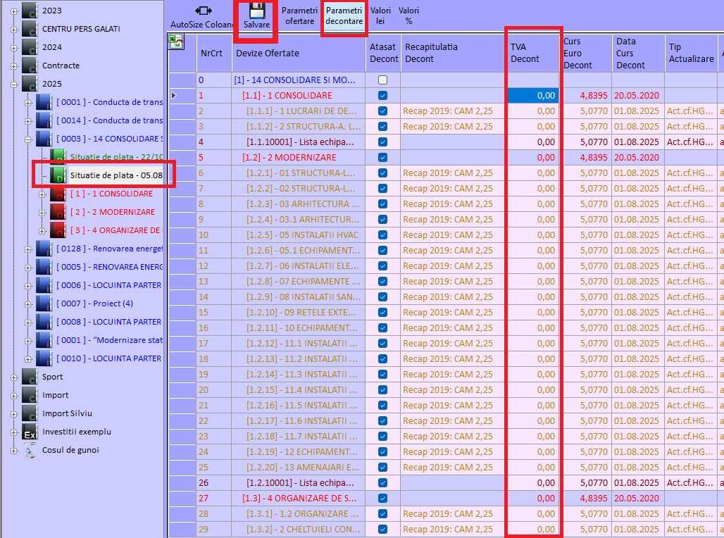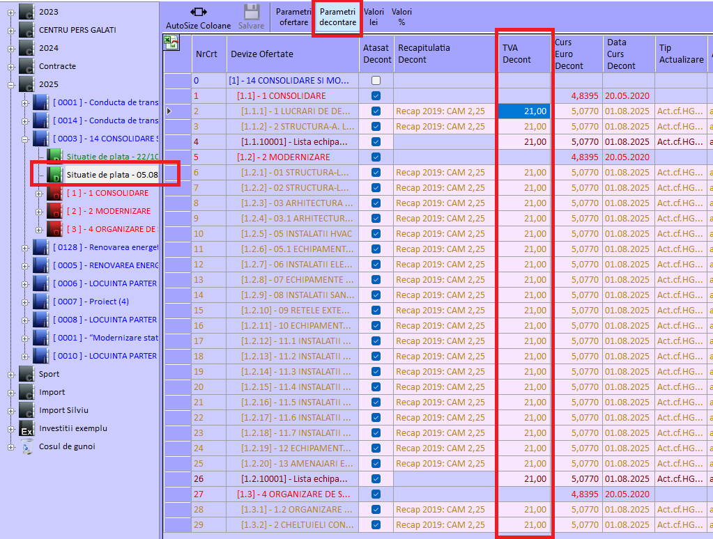 Conform pachetului de măsuri fiscale intrat în vigoare la 01.08.2025, TVA devine 21%. Modificarea de TVA se reflectă în aplicația Deviz Profesional astfel: În modulul Ofertare : - toate investițiile create după data de 1 august 2025 vor avea TVA setat implicit la 21%. - toate investițiile create înainte de data de 1 august 2025 vor avea TVA neschimbat, astfel daca se dorește actualizarea cotei de TVA la 21% atunci trebuie setat manual la nivel de investiție în pagina de Antet. - NOTĂ: orice lucrare nouă cu tip TVA diferit de 21% trebuie setat corespunzător la nivel de investiție în pagina de Antet, ca în imaginile de mai jos: ![]() După tastare TVA = 0 în dreptul investiției (sau punctual doar la anumite devize): ![]() În modulul Decontare : - toate Situațiile de plată create cu data >= 01.08.2025 vor avea TVA decontare setat implicit 21%. - centralizatoarele din decontare, des utilizate: BCSPV și Anexa 1.3 sunt armonizate cu cotele de TVA setate pe fiecare Situație plată în parte - NOTĂ: Pentru Situațiile de plată pentru care se dorește alegerea unei cote de TVA diferit de cea setată implicit, se va seta la nivel de Situație plată în pagina Parametri decontare ca in imaginile de mai jos: ![]() ![]() ![]() |